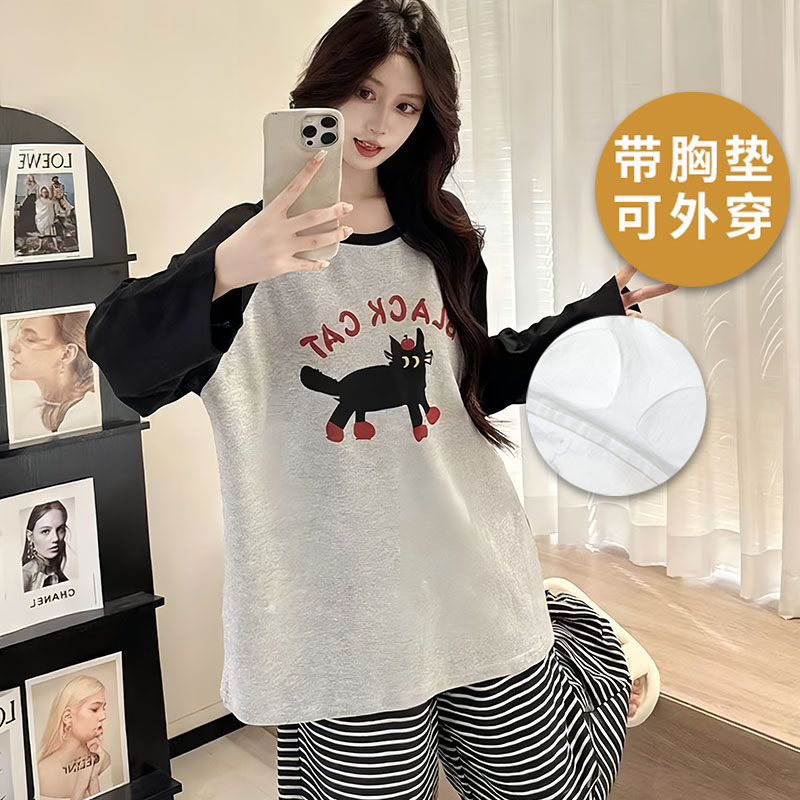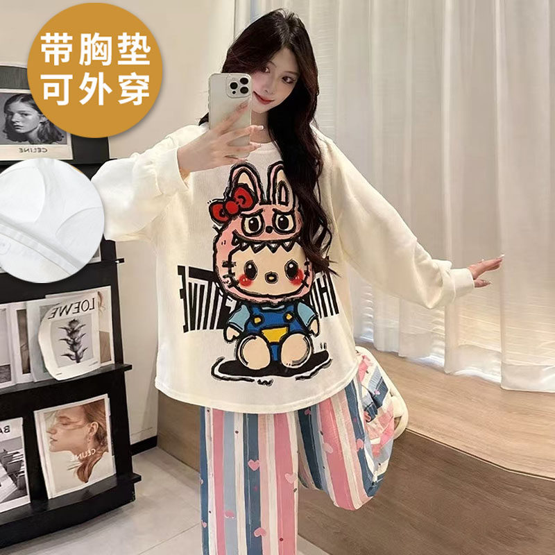 浪莎棉质带胸垫睡衣女春秋季长袖长裤薄款可外穿韩式家居服两件套 - 浪莎睡衣优选企业店