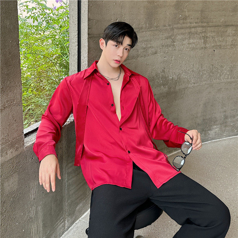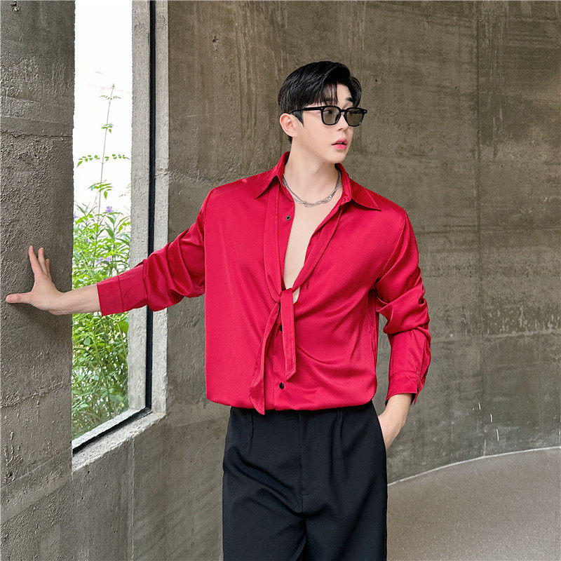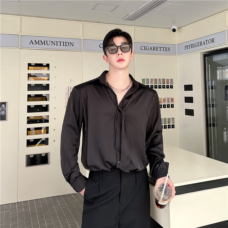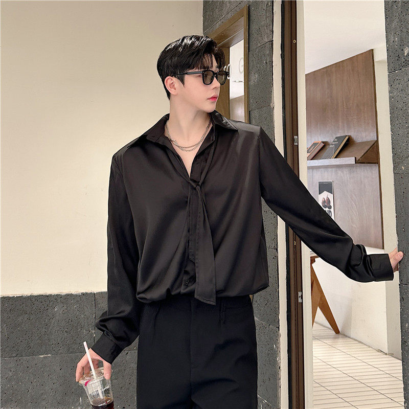 秋装禁欲系雅痞缎面光泽滑料领带设计垂感衬衫男长袖韩版垫肩衬衣 - 我爱文艺美型男