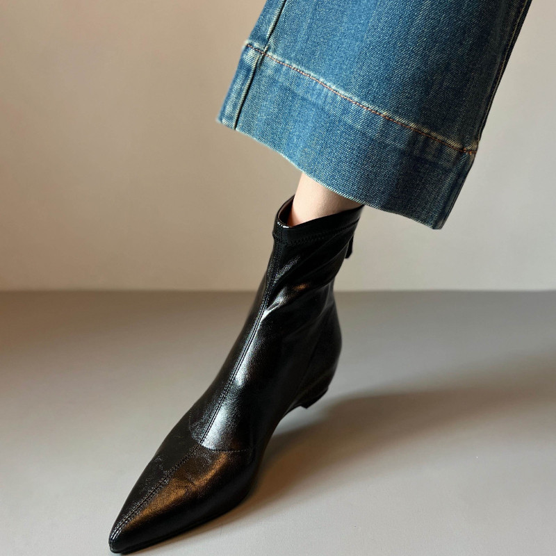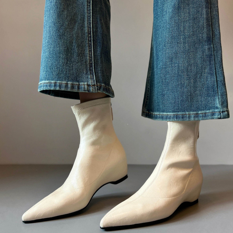 软底尖头短靴女真皮后拉链平底时装靴秋冬季新款复古内增高及踝靴 - 魅力 女王 时尚潮流馆