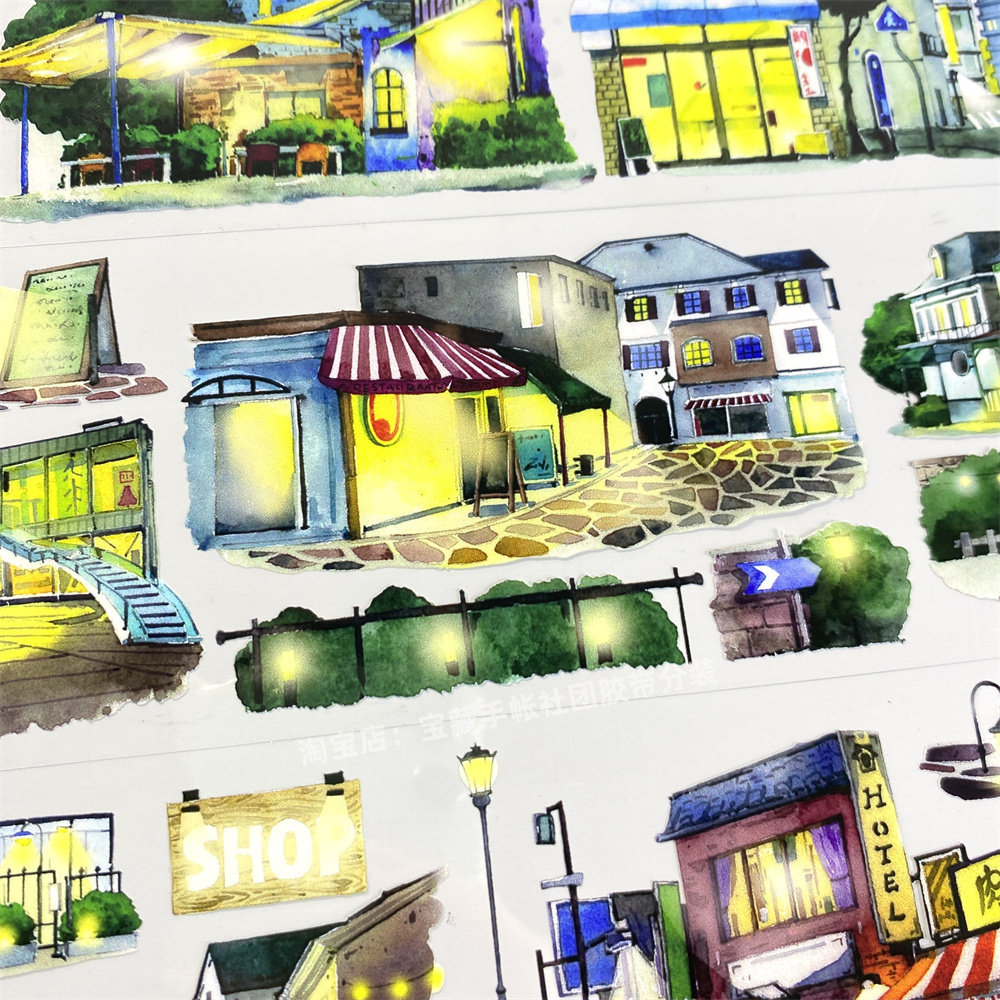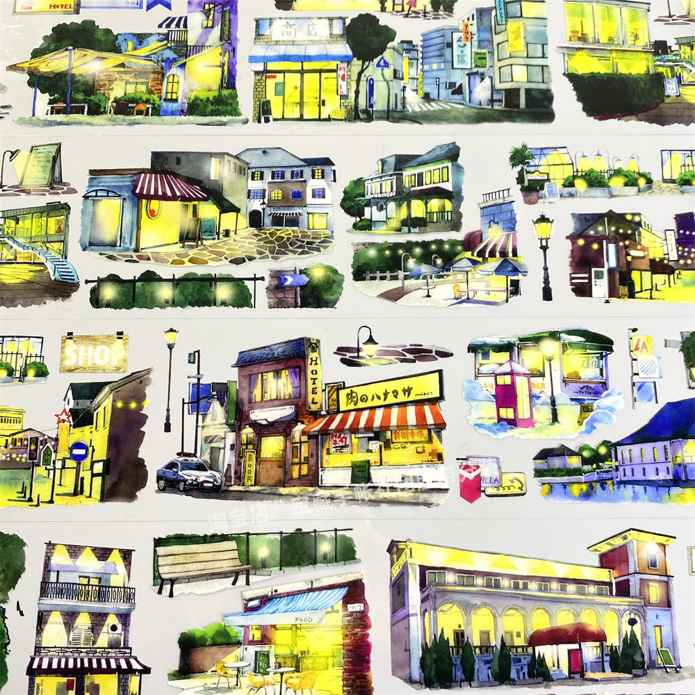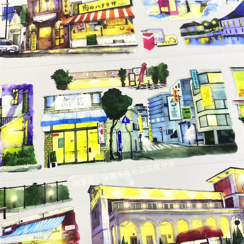 手帐分装胶带w44华灯初上景物志小镇街造景古风PET素材账流麻贴纸 - 宝藏手帐社团胶带分装