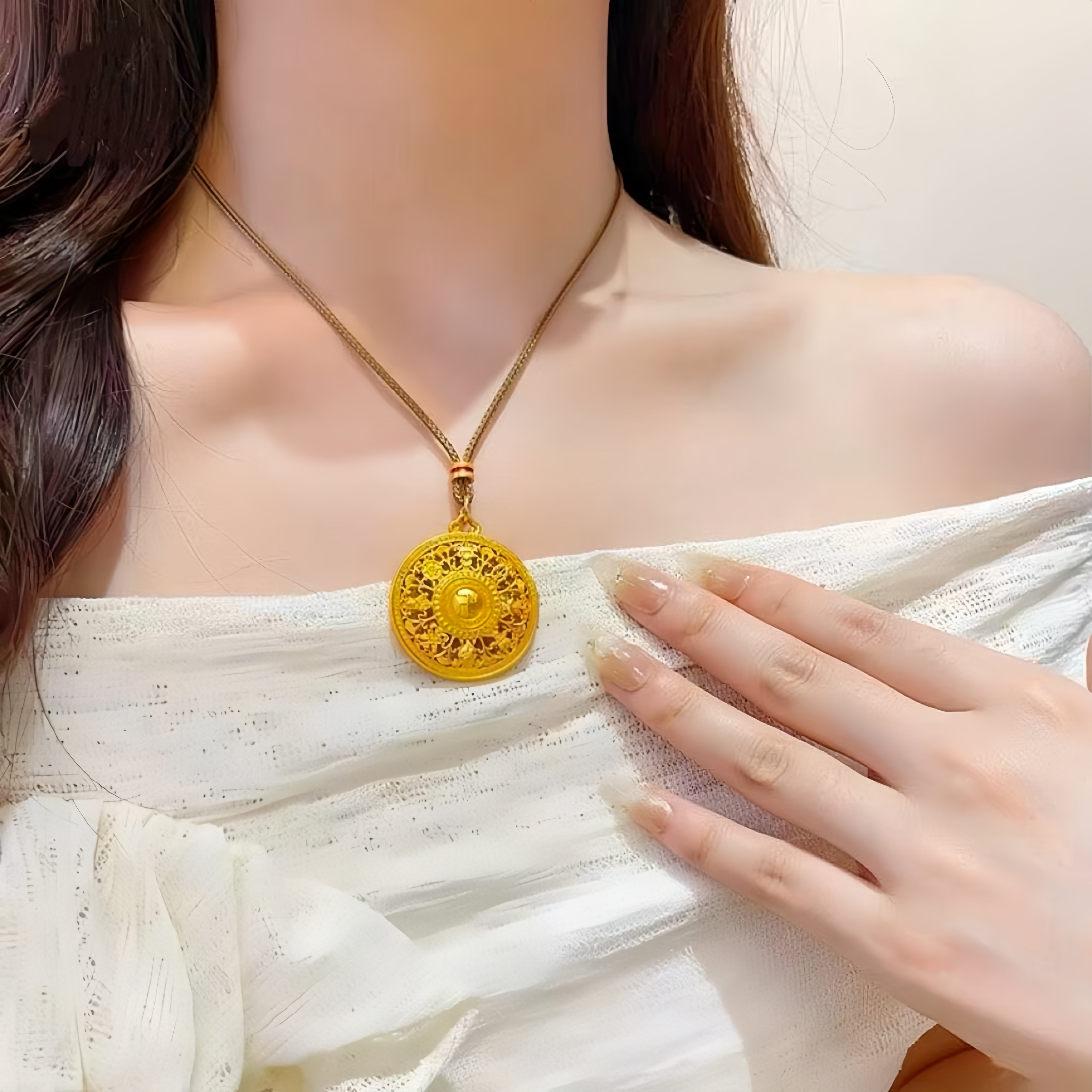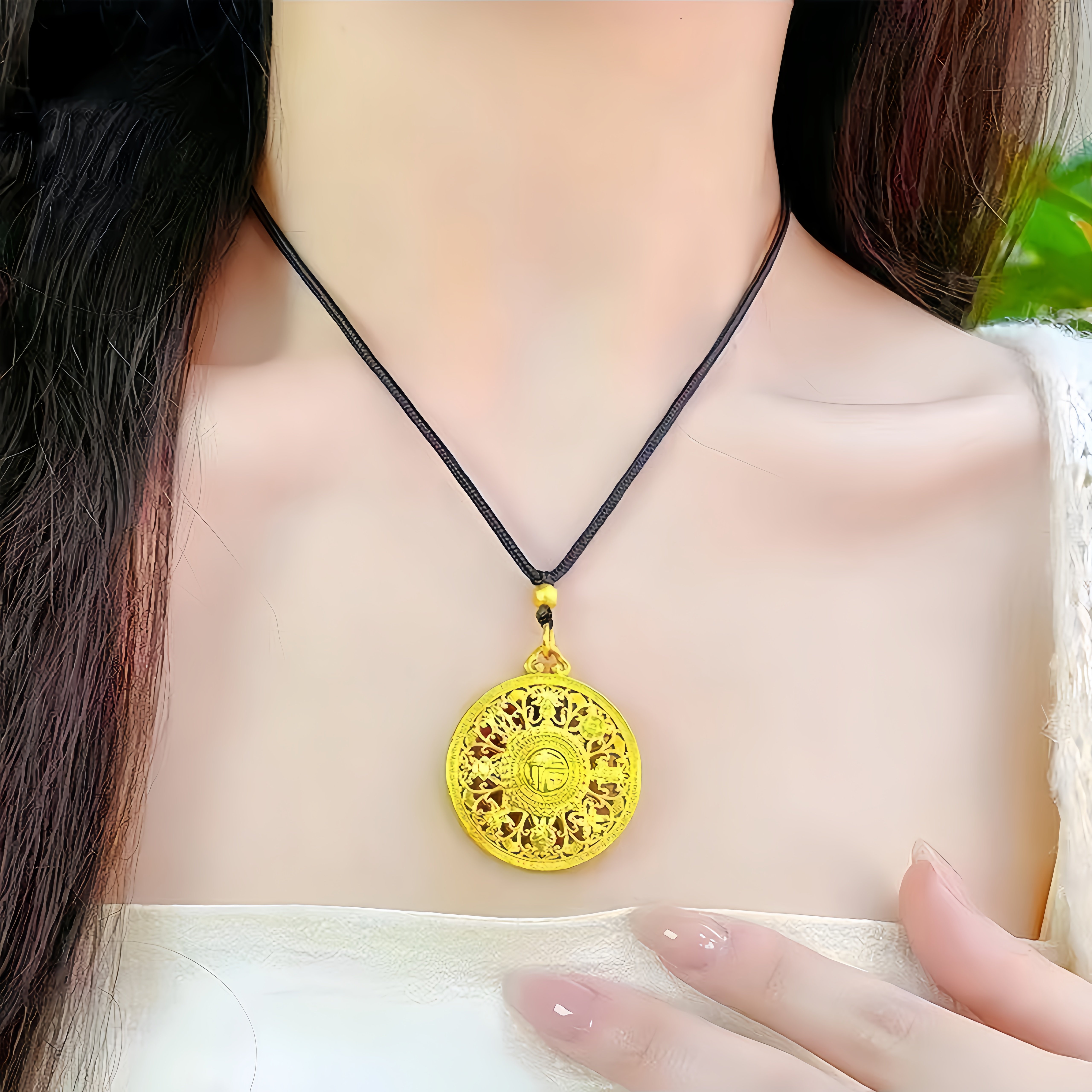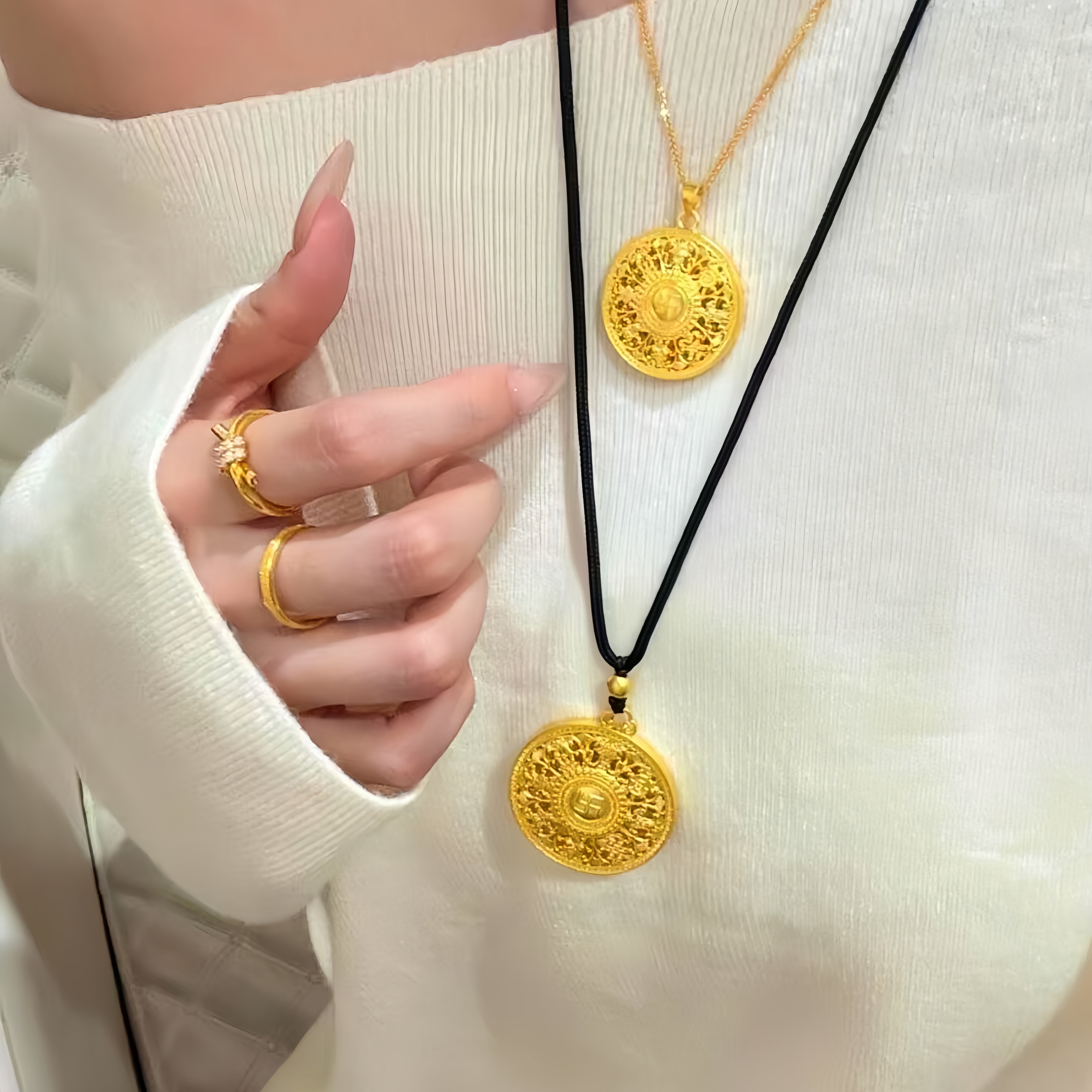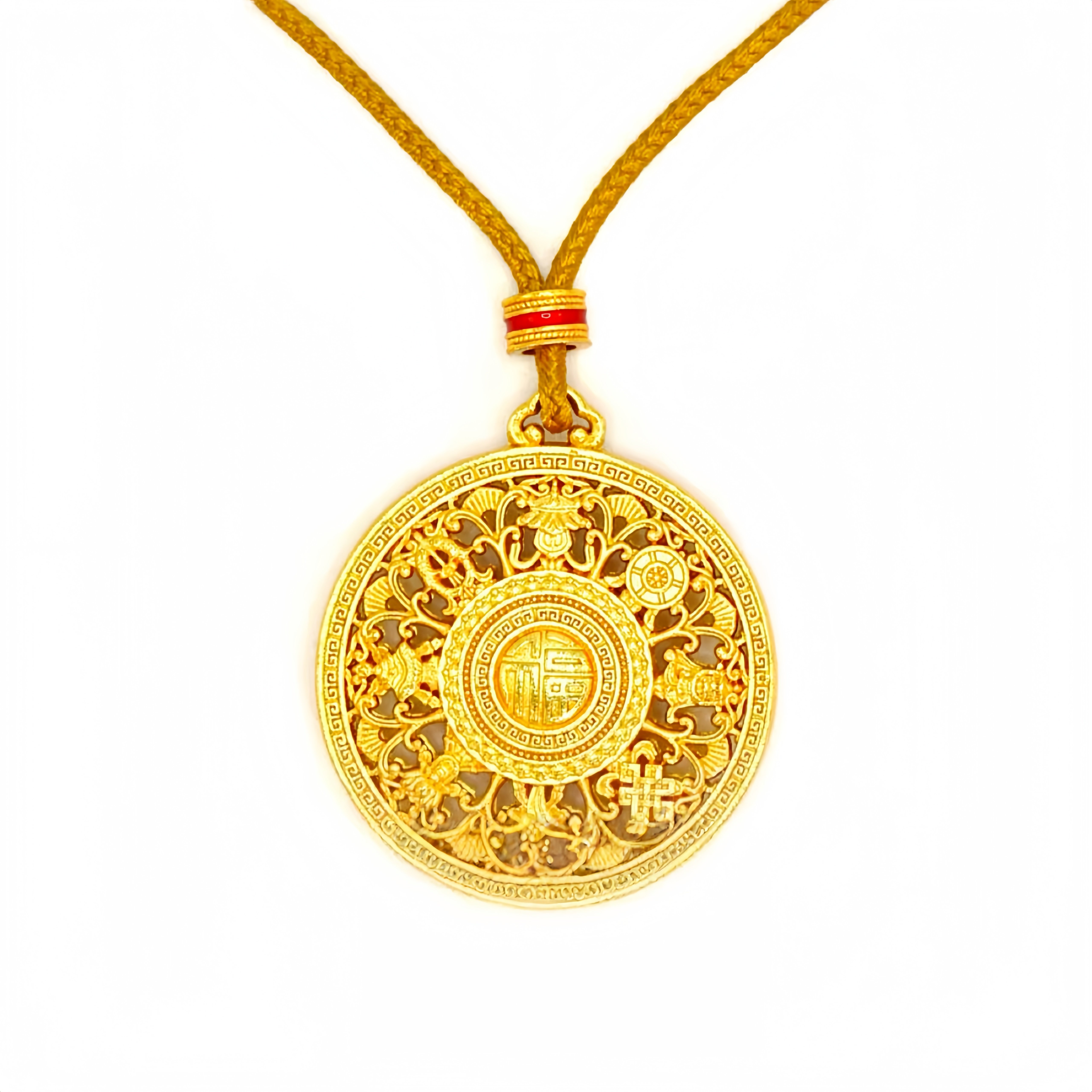 古法9999金包银八宝罗盘吊坠女镂空福字黄金项链挂件毛衣链送女友 - 香港免税金包银阁