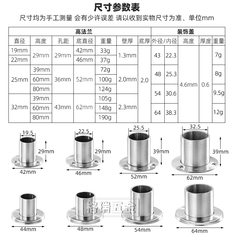 304不锈钢法兰座挂衣杆管座管托加厚高脚侧装座浴帘杆亮光方管座 - 三和框架连接件