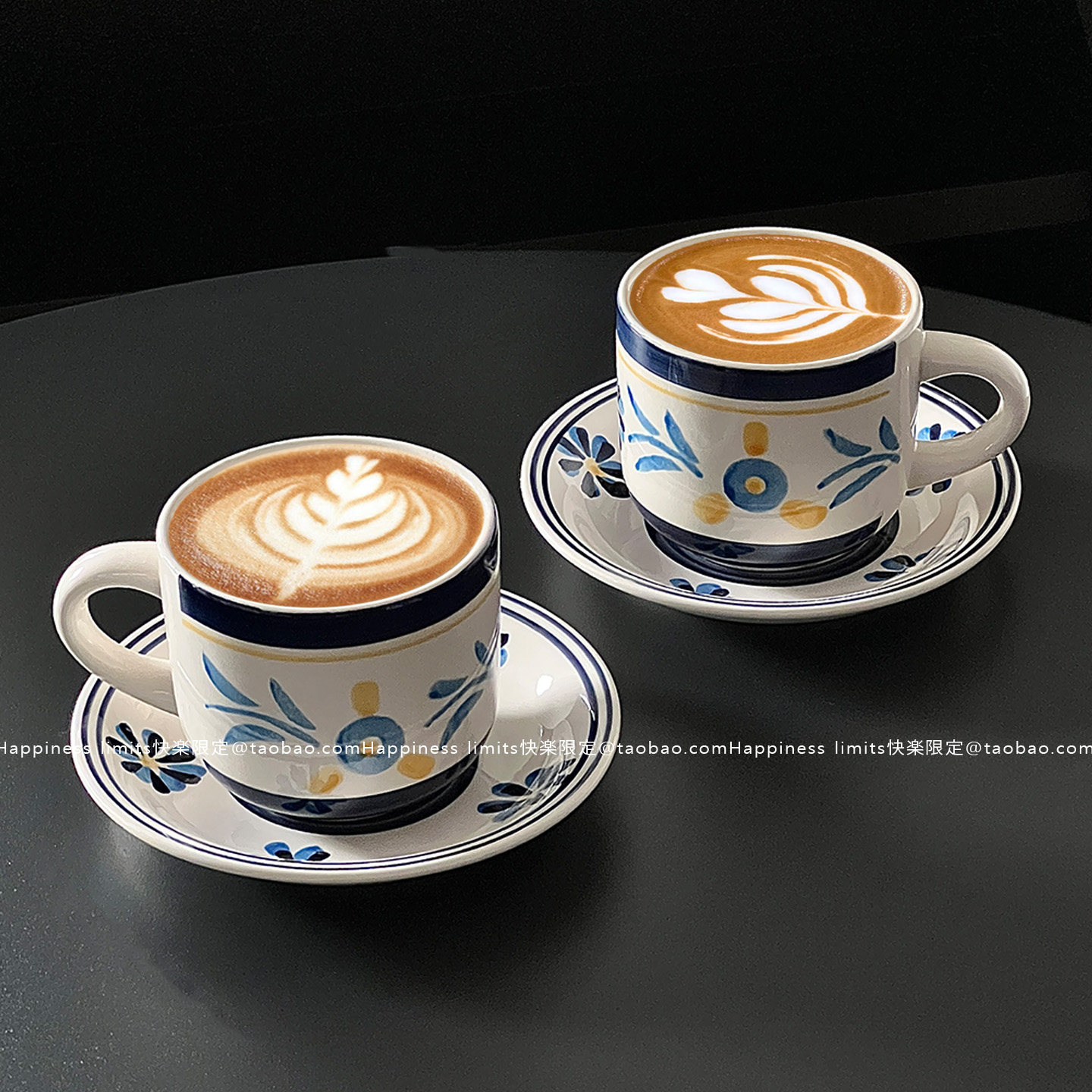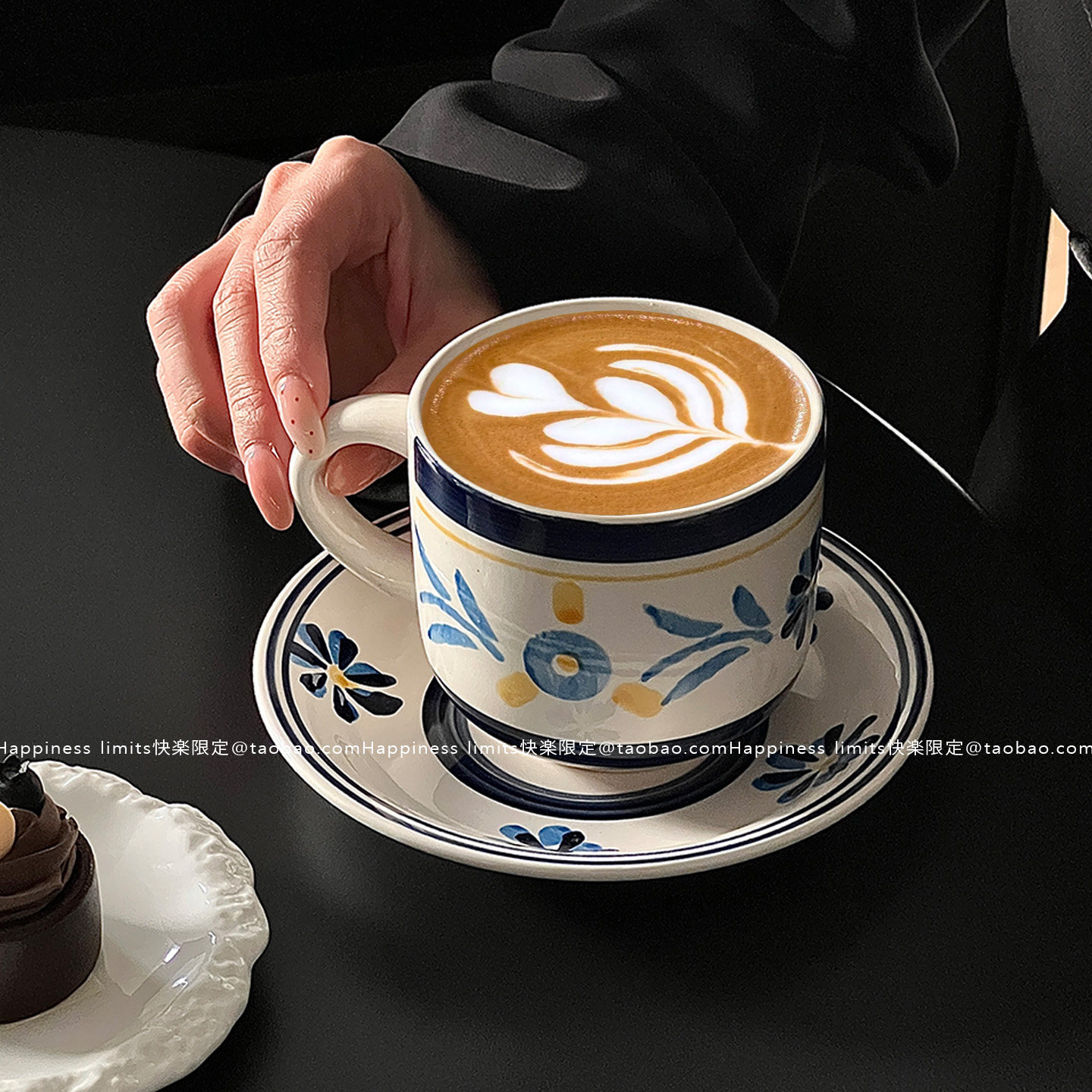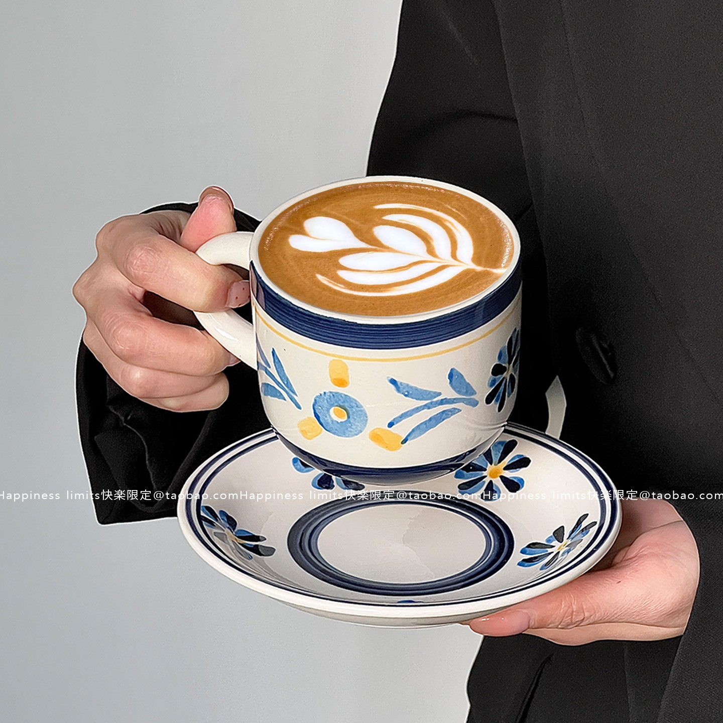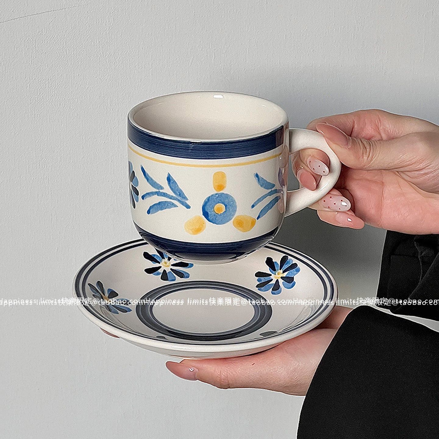 蓝色手绘复古小众陶瓷咖啡杯碟小花花马克杯韩国风摆拍杯碟餐厅 - Happiness limits快楽限定