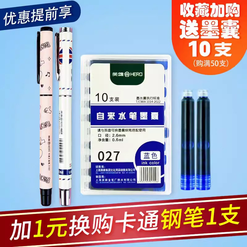 英雄钢笔墨囊2.6mm口径学生卡通钢笔原装墨囊027可擦墨囊套装部分钢笔墨囊可替换蓝黑纯蓝通用型小口径两用 - 瀚然办公专营店