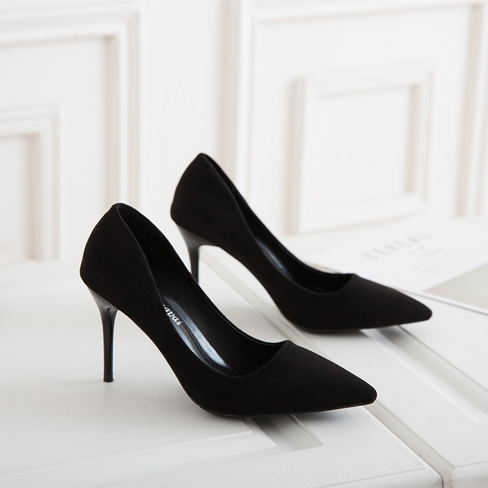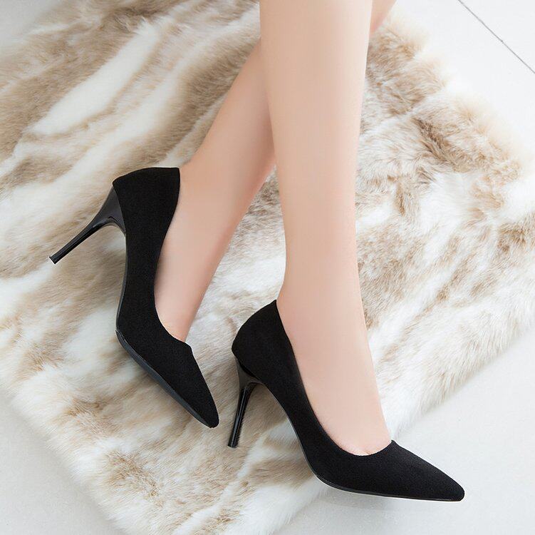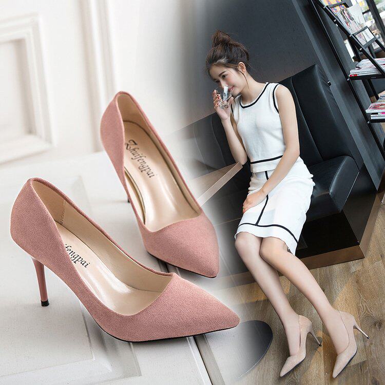 高跟鞋女胖脚脚宽6-8cm高跟鞋杏色绒面学生礼仪正装细跟中跟单ol3 - 莉雯鞋业