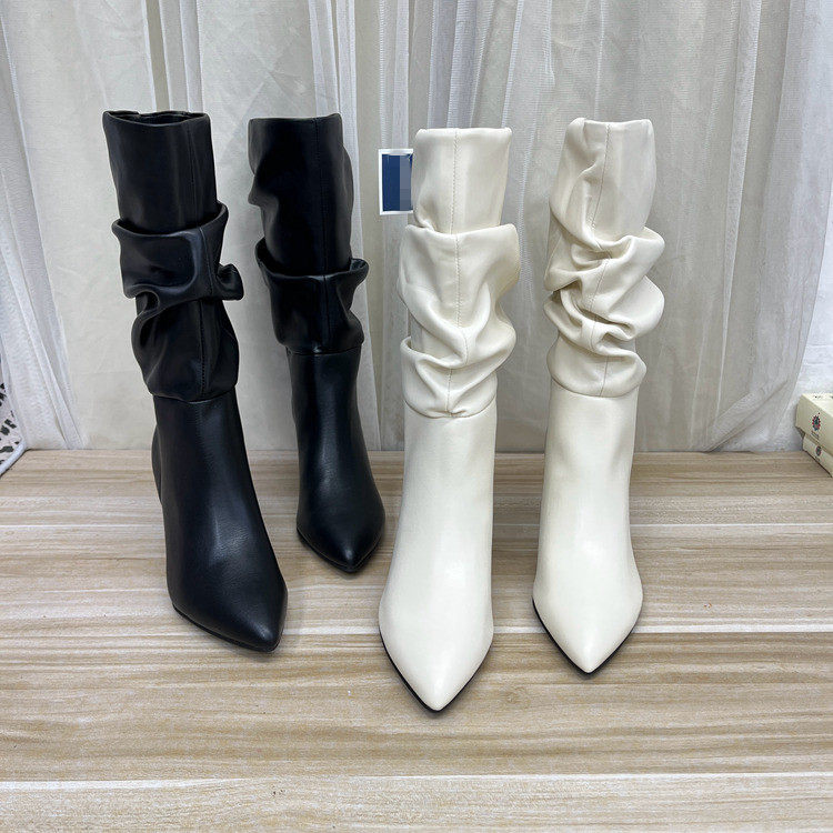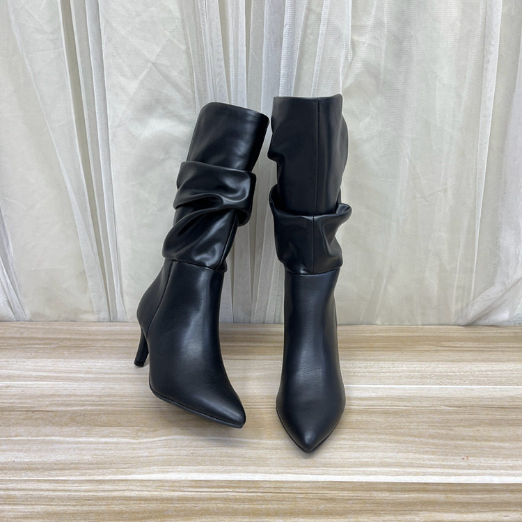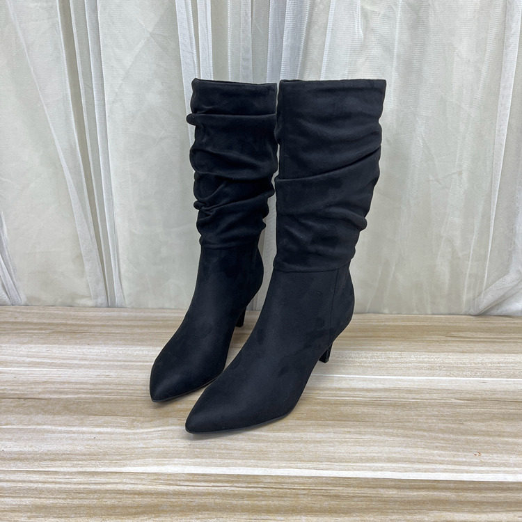 外贸原单女靴新款尖头纯色细高跟套筒时装中筒靴时尚百搭堆堆靴 - 方小姐外贸女鞋